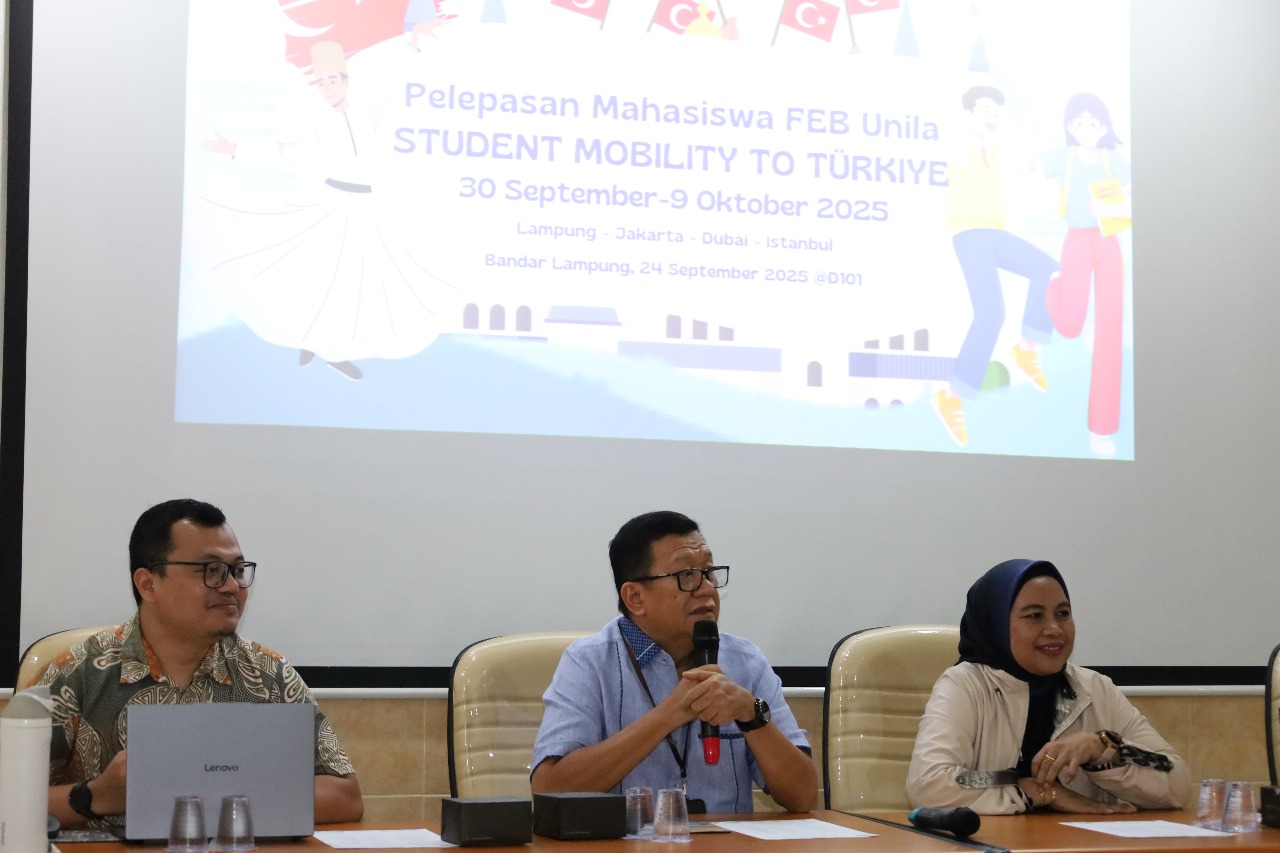 FEB Unila – Fakultas Ekonomi dan Bisnis (FEB) Universitas Lampung (Unila) menyelenggarakan acara pelepasan mahasiswa peserta Student Mobility ke Istanbul, Turki, pelepasan digelar pada Rabu, 24 September 2025 di ruang D101 FEB Unila.