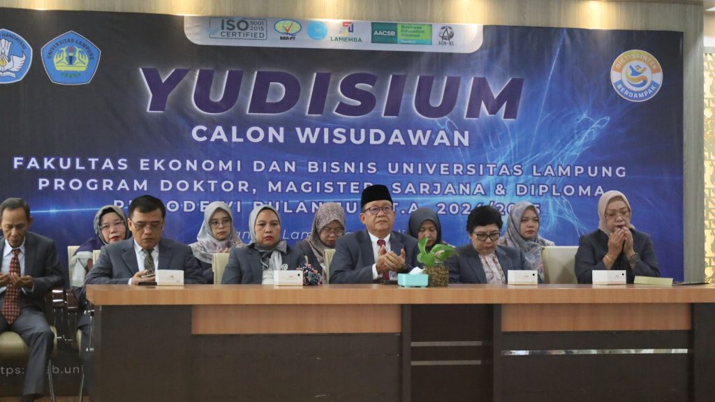 FEB Unila – Dekan Fakultas Ekonomi dan Bisnis (FEB) Universitas Lampung Prof. Dr. Nairobi, S.E., M.Si Yudisium 99 Calon Wisudawan pada Periode VI Batch 1 di Auditorium Student Center FEB Unila, pada Kamis 17 Juli 2025.