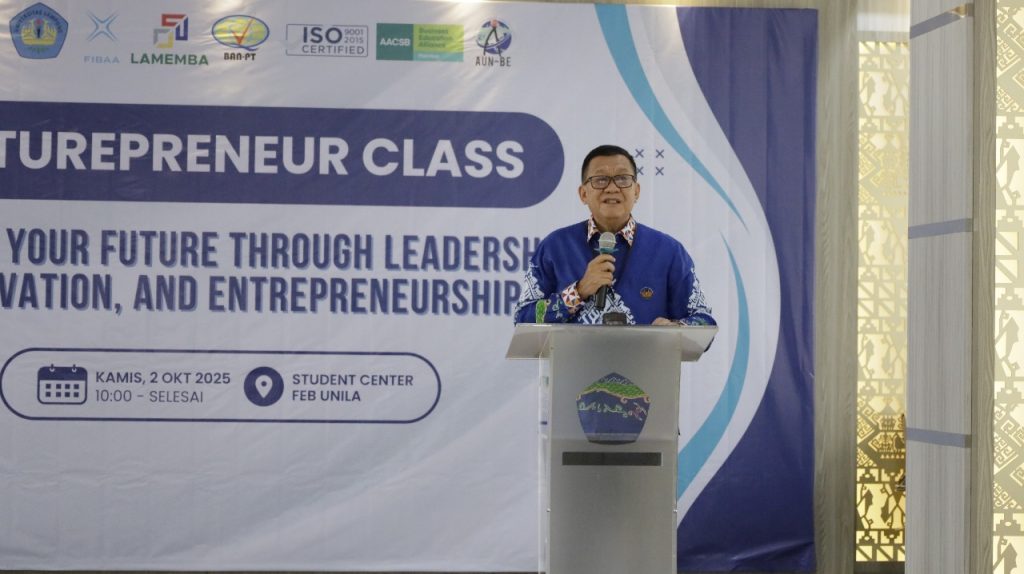 FEB Unila – Fakultas Ekonomi dan Bisnis Universitas Lampung (FEB Unila) menggelar Futurepreneur Class dengan tema “Level Up Your Future Through Leadership, Innovation, and Entrepreneurship” di Student Center FEB Unila, Kamis, 2 Oktober 2025