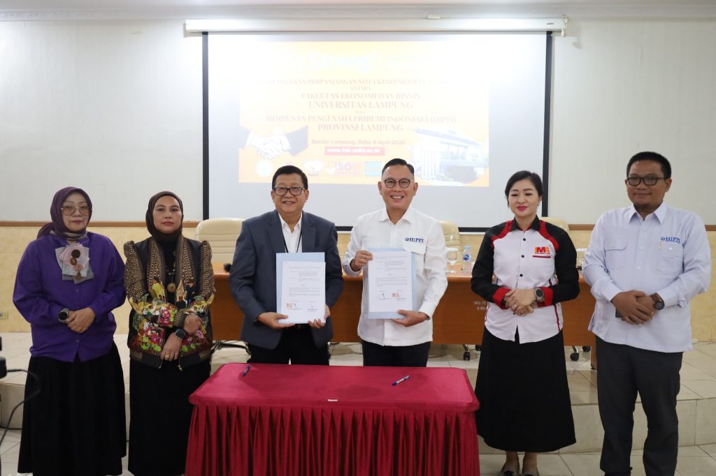 FEB Unila – Fakultas Ekonomi dan Bisnis Universitas Lampung (FEB Unila) kembali memperkuat jejaring kemitraan strategis melalui penandatanganan nota kesepahaman dan kerja sama bersama Indonesia Marketing Association (IMA) serta Himpunan Pengusaha Pribumi Indonesia (HIPPI).