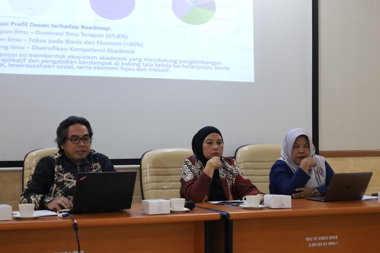Dalam sambutannya, Dekan FEB Unila, Prof. Dr. Nairobi, S.E., M.Si., menegaskan pentingnya penyusunan roadmap sebagai upaya memperkuat peran fakultas dalam pengembangan ilmu ekonomi dan bisnis yang inovatif serta responsif terhadap perubahan zaman.